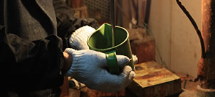 - 混合攪拌した原料を金型に流し込みます。気泡を巻き込まずにすばやく流し込む必要があるため、最も熟練を要する工程です。常圧注型に適した金型の設計に、当社独自のさまざまな経験・工夫(ノウハウ)が生かされています